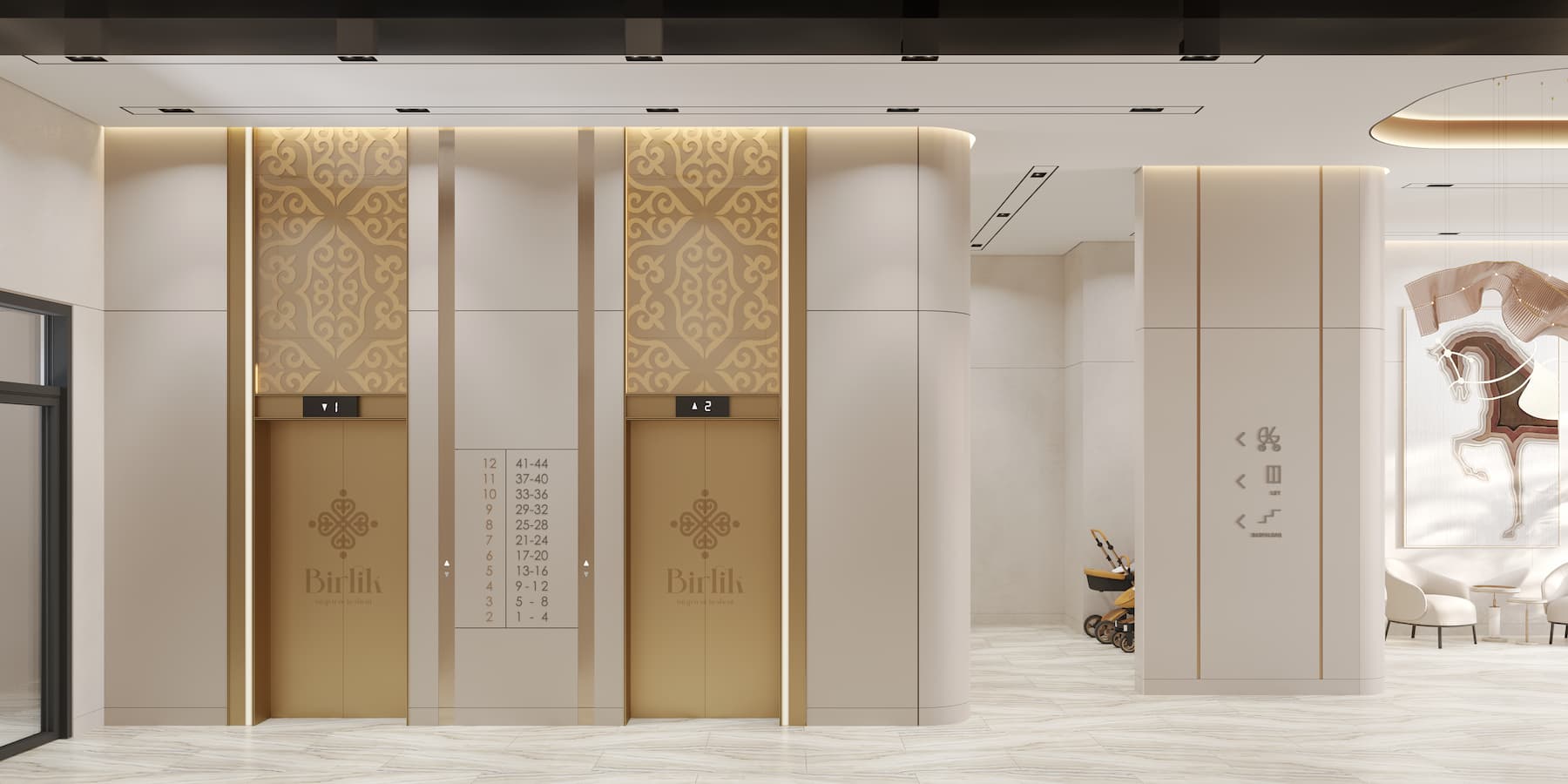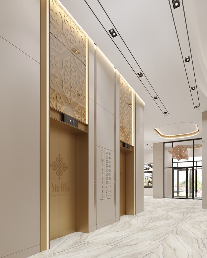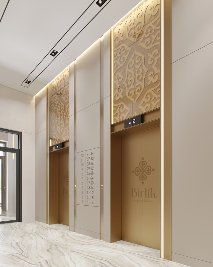 Холлы в жилом комплексе BIRLIK выполнены по индивидуальному дизайнерскому проекту. Высокие потолки и светлый интерьер создают ощущение простора, а использование премиальних материалов обеспечивает эстетичный внешний вид и долгую службу.