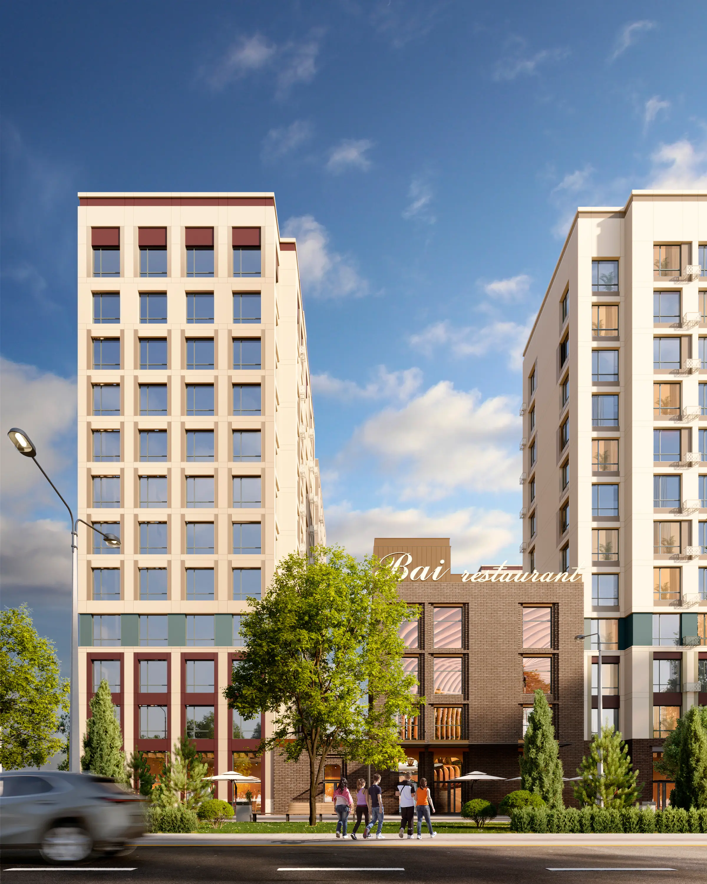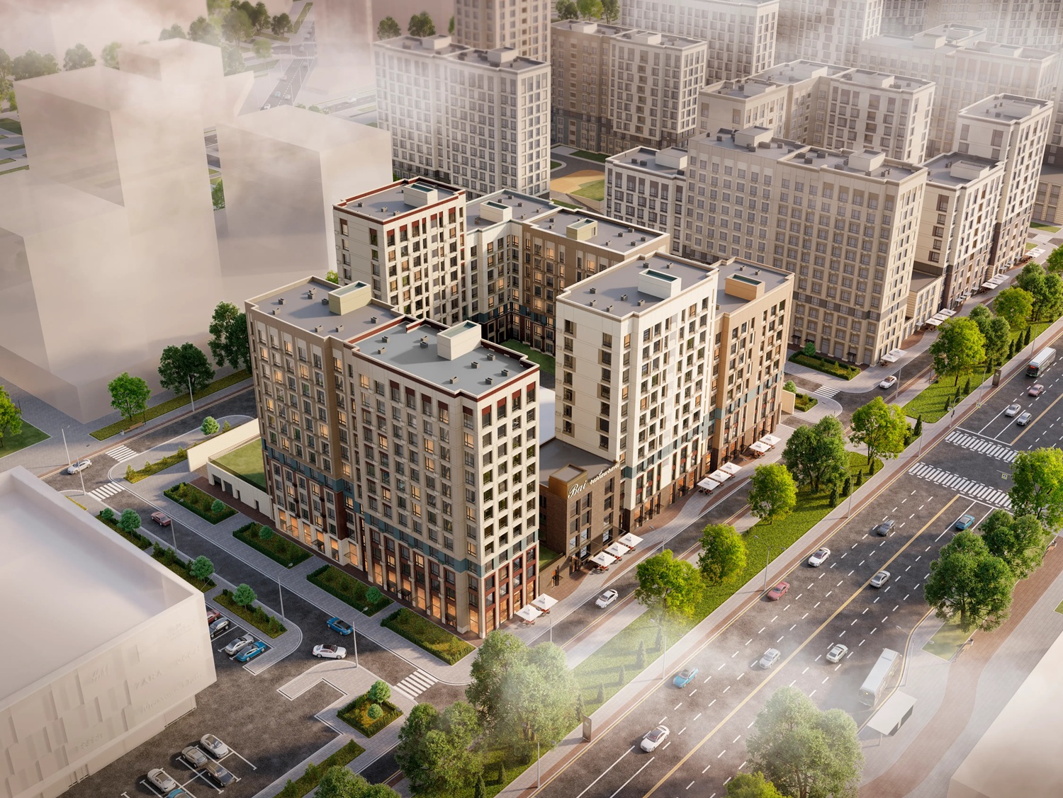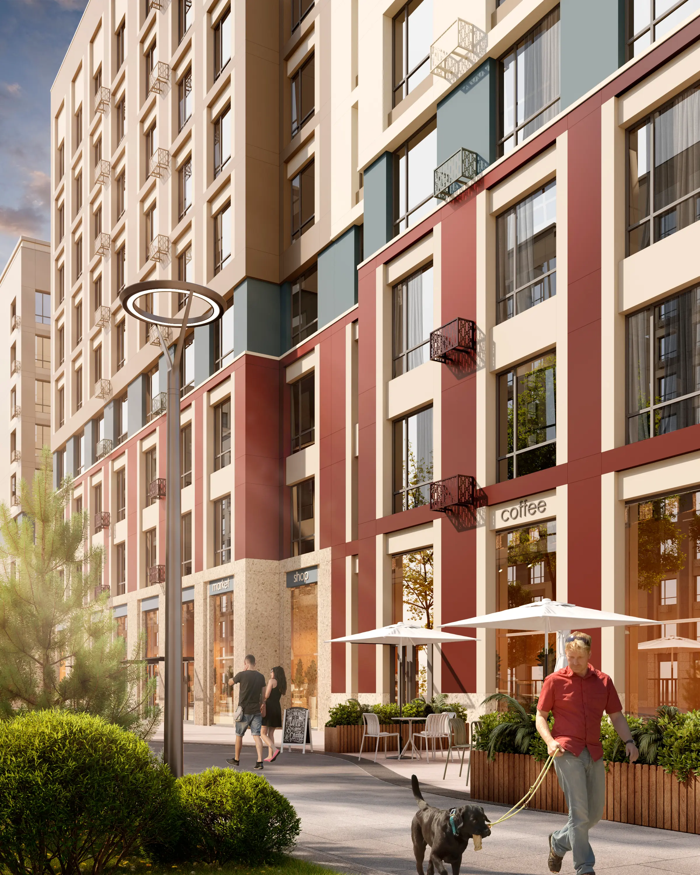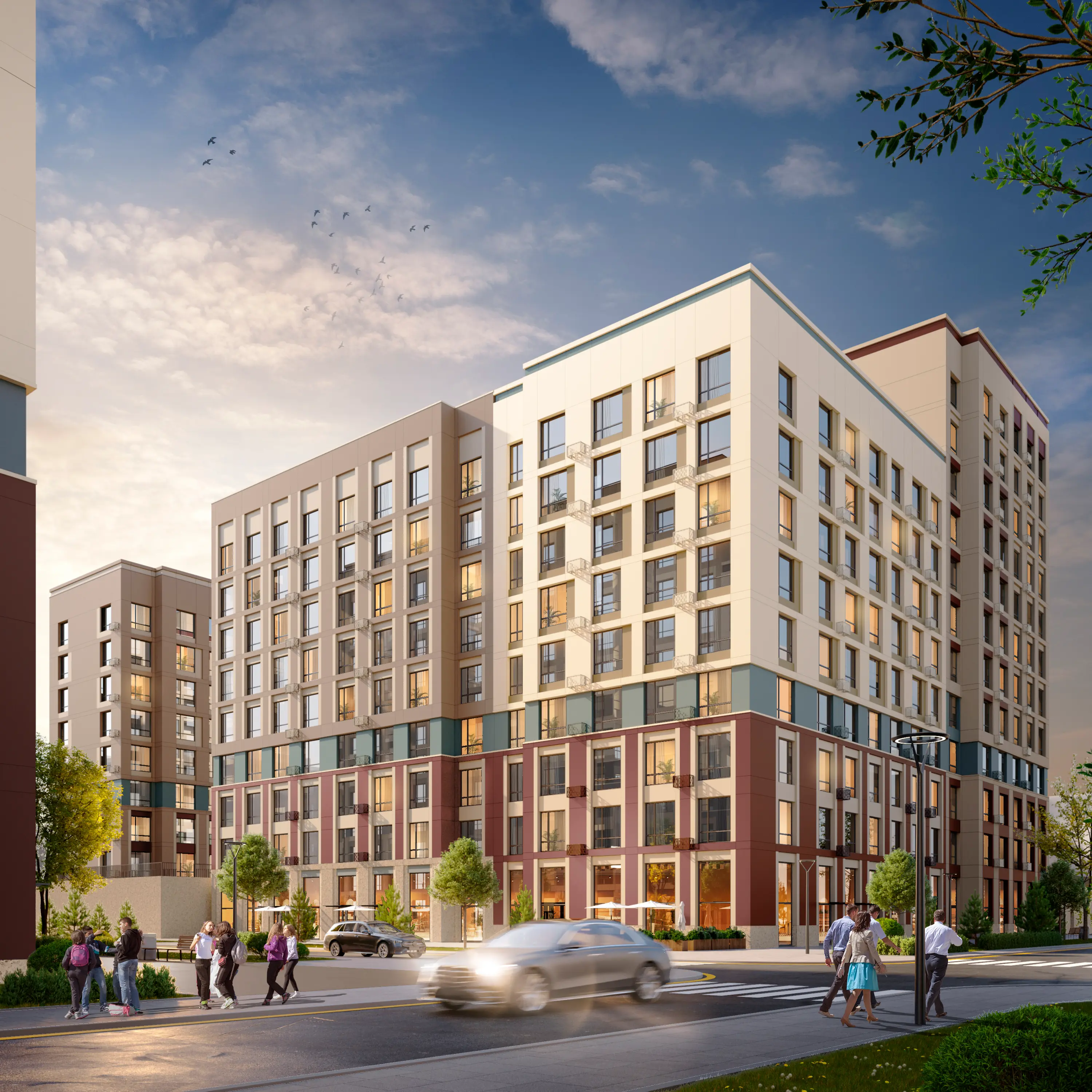 Ночью архитектуру домов будут подчеркивать прожекторы повышенной выносливости с низким электропотреблением. Свет прожекторов направлен на внешние улицы и не проникают в квартиры.