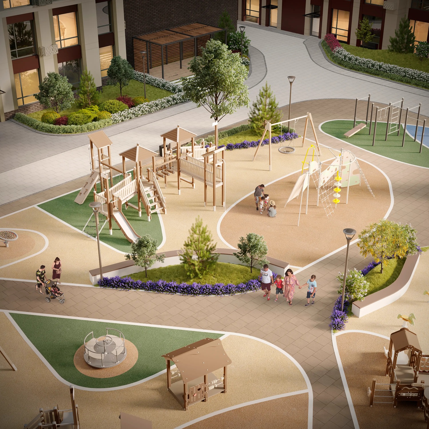 Тут вы можете насладиться гармоничным дизайном и почувствовать себя в безопасности. Каждая зона имеет специальное тартановое покрытие. Вход во двор контролируется системой и видеонаблюдением. Также двор изолирован от городского шума особенностями строения домов